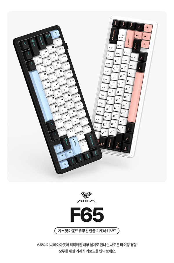AULA F65 유무선 시리즈는 기존 87키(F87Pro), 99키(F99), 108키(F108)에 이어 미니 레이아웃이 적용된 65%(67키) 기계식 키보드이며 우측의 숫자 패드와 기능키는 물론, 상단의 펑션(F1~F12)키까지 생략하여 극대화된 공간 활용도와 휴대성을 갖춰 문서 타이핑 및 게이밍에 집중적으로 활용되는 키만 배치되어 있기에 미니멀한 디자인과 넓은 공간 활용이 필요한 유저에게 최적화된 모델이다.