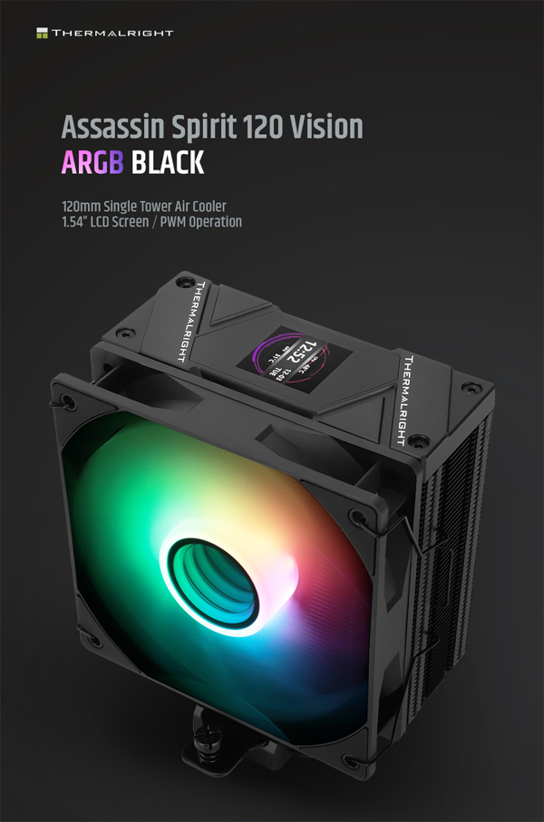 서멀라이트 어쌔신 스피릿 120 비전 ARGB는 싱글 타워 규격의 공랭 쿨러 제품이다. 제공되는 쿨링팬은 하나인 싱글 팬 방식이며, ARGB LED를 지원해 다양한 사용자 지정 조명 효과 설정이 가능하다. 제품 색상은 히트싱크와 쿨링팬에 색상에 맞춰진 블랙과 화이트로 나뉜 2종이 준비되어 있다.