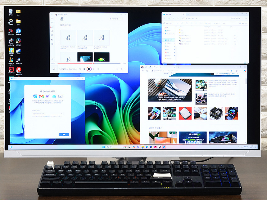 테스트를 위해 책상에 키보드를 셋팅한 모습으로 풀사이즈 지만 슬림 베젤이 적용되어 많은 공간을 차지하지 않았다. 집이나 사무실 등에서 편하게 사용할 수 있을 것이다. (참고로 모니터의 크기는 27형 이다.)