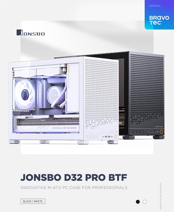 브라보텍에서 BTF 메인보드 지원을 위한 미래 지향적 설계와 5면 스퀘어패턴 패널의 혁신적인 쿨링이 돋보이는 M-ATX 케이스 JONSBO D32 PRO BTF를 새롭게 선보인다.
