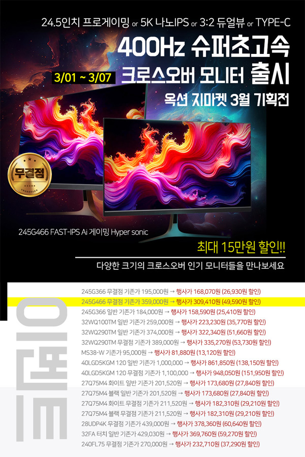 이번 행사동안 크로스오버의 빅포터블, 24, 27, 28, 32, 40형 등 다양한 모니터를 구입하면 최대 150,000원 파격할인을 실시한다.