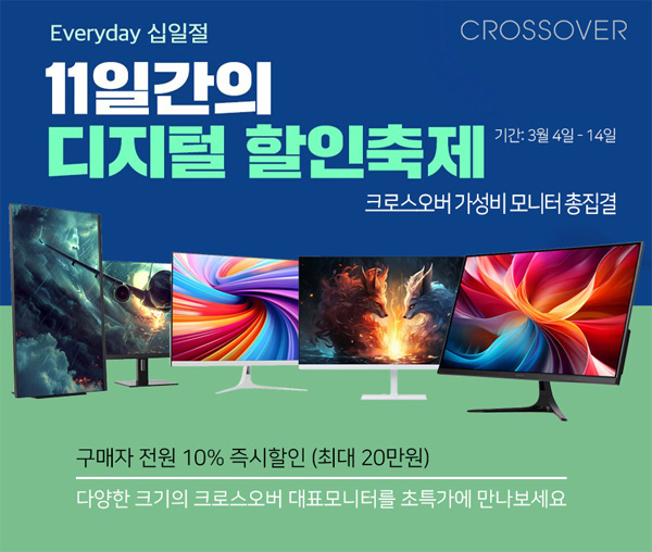 크로스오버는 자사의 인기 고해상도, 게이밍 모니터 46종을 대상으로 11번가 3월 디지털 십일절 새학기 프로모션을 진행한다고 밝혔다.