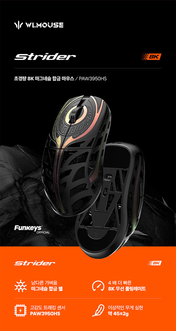 Strider 시리즈는 Black, White, Gold, Purple 네 가지 색상으로 구성되어 있으며, 마그네슘 합금 하우징 및 타공 설계를 적용하여 각각 45g의 놀랍도록 가벼운 무게가 가장 큰 특징이다. 성능면에서 무선 연결시 최대 8,000Hz라는 높은 폴링레이트를 달성하여 하드 게이밍 및 작업에서도 끊김 없는 성능을 제공한다.