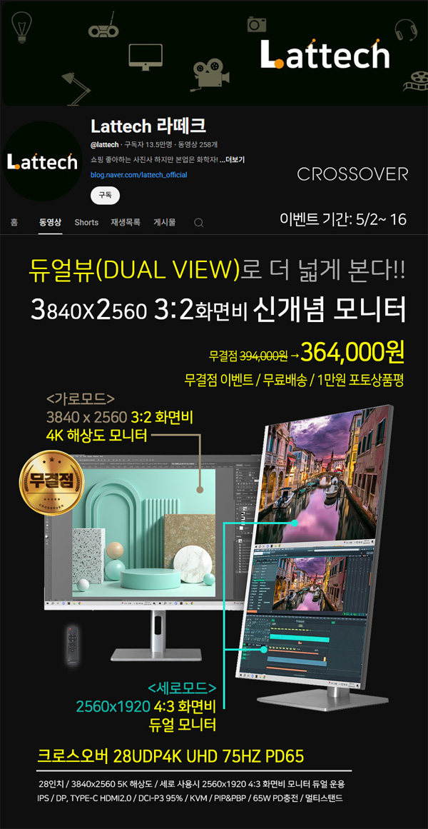 크로스오버가 28형 3:2 전문가 화면비를 가진 듀얼뷰 모니터 ‘28UDP4K UHD 75HZ PD65 무결점’을 대상으로 라떼크 특가를 진행한다.