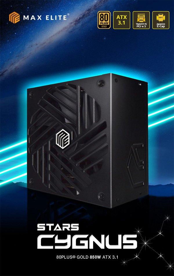 STARS CYGNUS 시리즈는 맥스엘리트에서 MAXWELL 시리즈에 이어 새롭게 출시하는 STARS 라인업으로 맥스엘리트 파워서플라이 전문 기술력을 담아, 145mm 깊이의 파워에 빈틈 없는 140mm FDB 팬 장착으로 많은 풍량에 의한 강력한 쿨링 성능과 함께 낮은 팬 회전 속도 (RPM)으로 정숙한 작동이 돋보이는 제품이다. STARS CYGNUS 시리즈는 STARS 시리즈에서도 80PLUS GOLD 등급의 고효율과 최신 ATX 3.1 규격을 완벽 지원하는 제품들로 구성되었다.