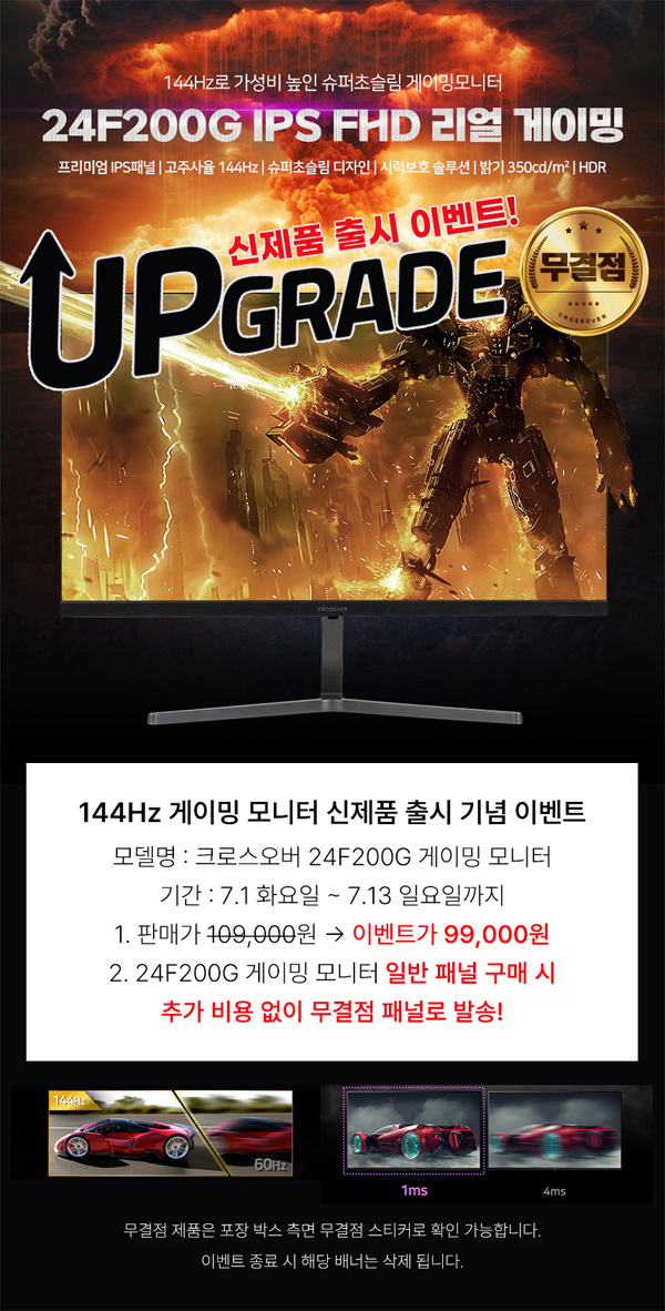 네이버 스마트스토어를 대상으로 7월 1일(화) ~ 7월 13일(일)까지 2주간 진행되는 이번 출시 기념 행사에서 크로스오버 24F200G IPS FHD 리얼 게이밍 일반 버전을 구입하면 무결점 모델로 출고된다. 기존가 109,000원 → 99,000원 (1만원 인하)으로 할인된 가격에 판매된다.