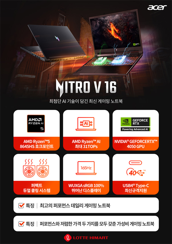 에이서가 데일리 게이밍 노트북인 '니트로 V 16'을 전국 롯데하이마트 163개 지점에 입점하며 오프라인 유통망 확대에 나선다.