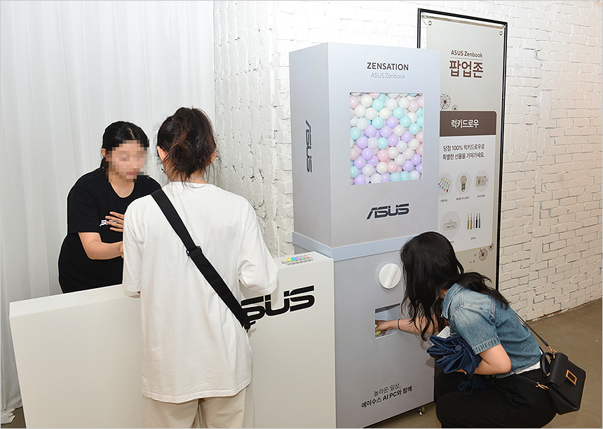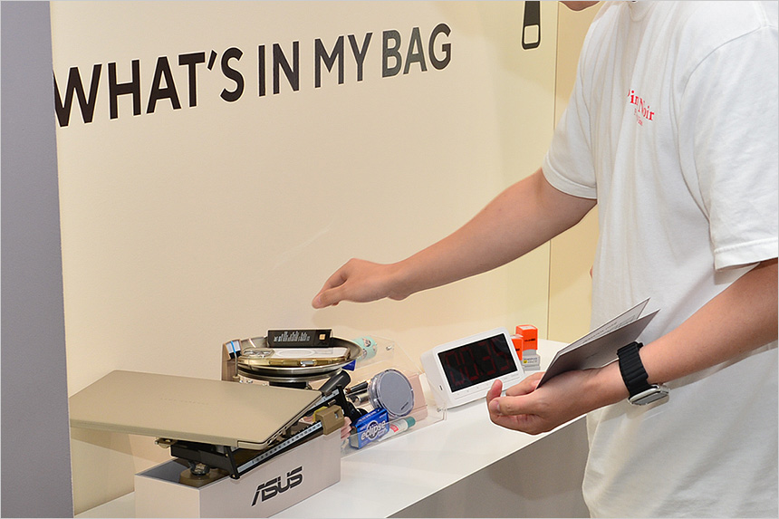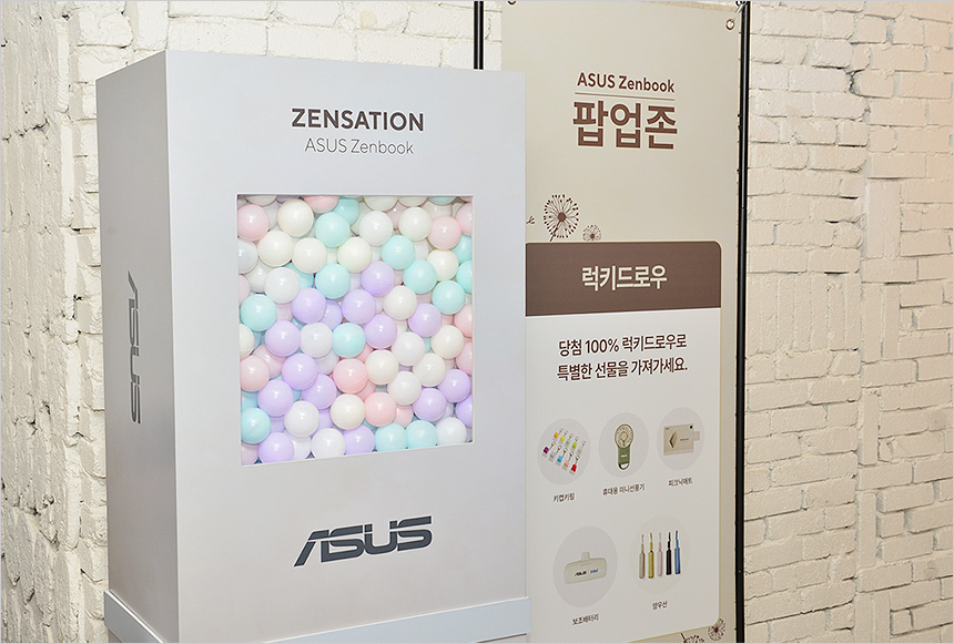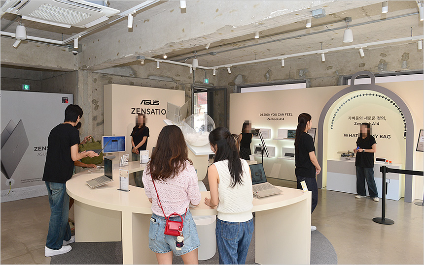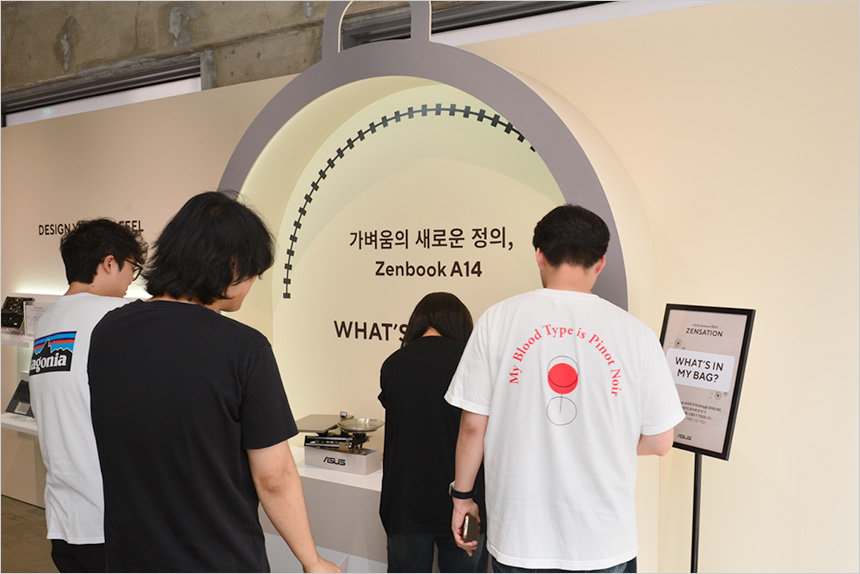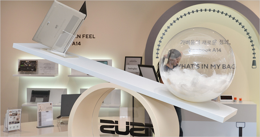 젠북의 가벼움을 직관적으로 경험할 수 있도록 ‘왓츠 인 마이 백(What’s in my bag)’ 코너가 함께 운영되고 있다. 방문객이 소지품을 활용해 젠북 A14의 무게인 899g을 정확하게 맞출 경우, 럭키드로우 참여 기회가 추가로 제공된다.