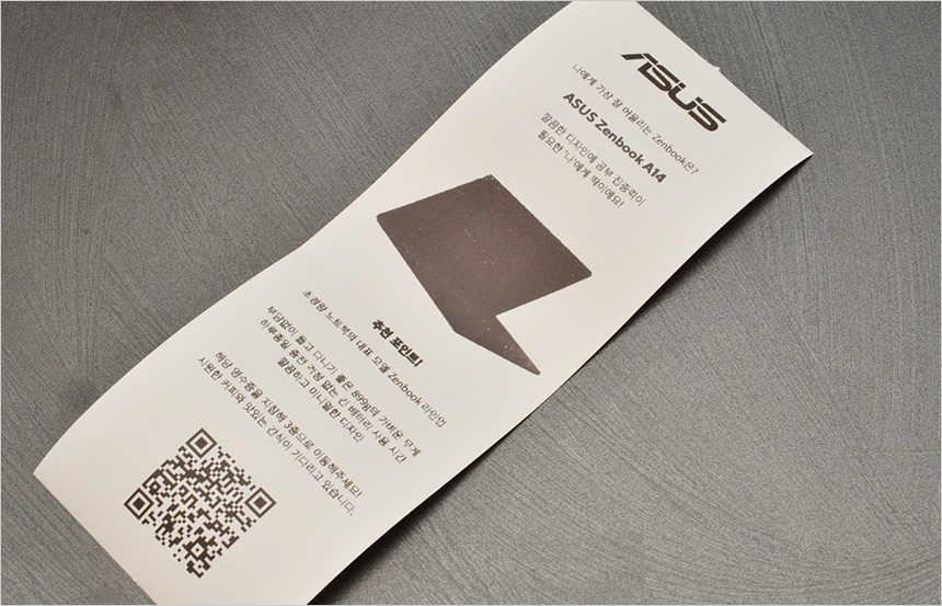 프리미엄 슬림 노트북 젠북 A14의 모습으로 1Kg 초중반의 무게를 가진 경쟁모델 대비 편하게 들고 다닐 수 있으며 14형 디스플레이 탑재로 크기를 최소화 해 파우치를 사용해 단독 휴대하거나 일반 가방에 넣고 다니며 사용할 수 있다.