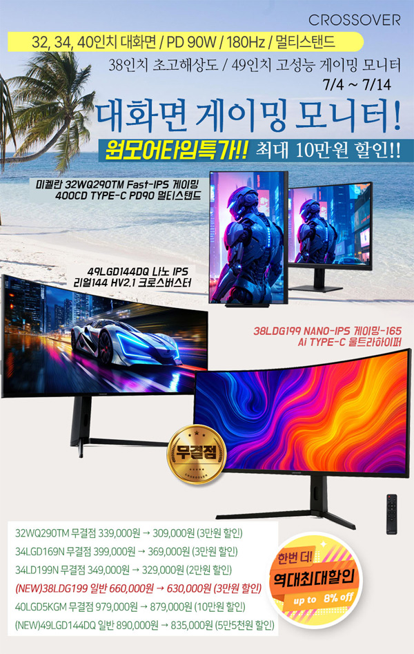 이번 행사동안 크로스오버의 인기 32인치 및 34인치, 38인치, 40인치 및 49인치 모니터를 구입하면 최대 10만원 할인을 받을 수 있다.