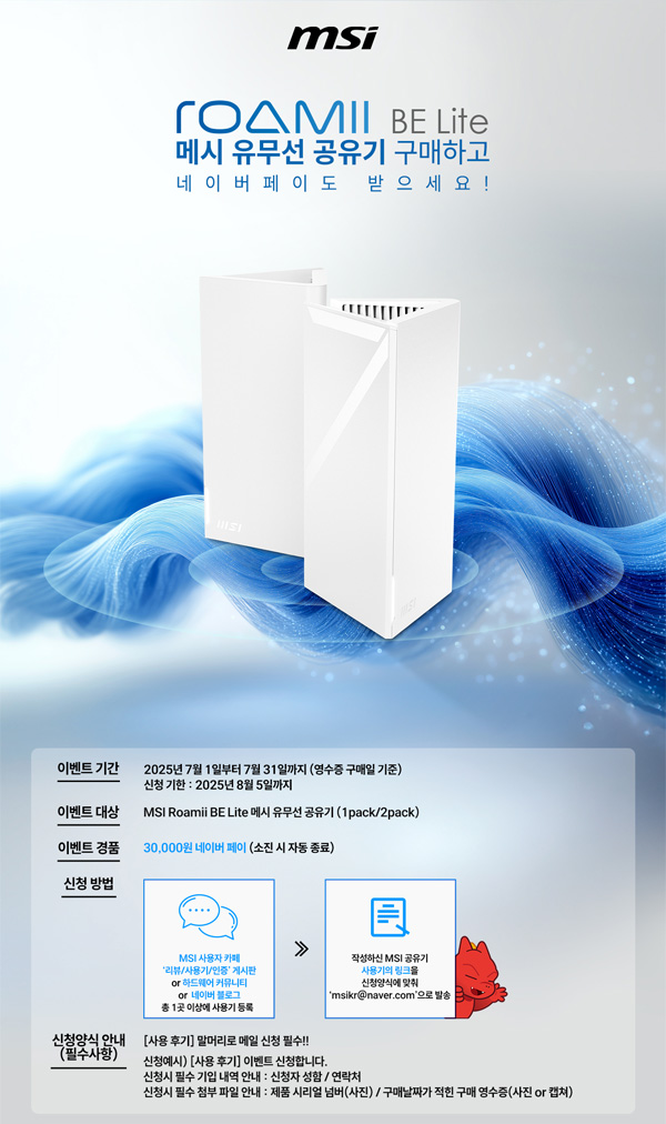 이번 행사는 2025년 7월 1일부터 7월 31일까지 MSI Roamii BE Lite 메시 유무선 공유기를 구매하고 사용기를 작성한 고객을 대상으로 진행된다. 기간 내 구매자들은 2025년 8월 5일까지 이벤트를 신청할 수 있다.