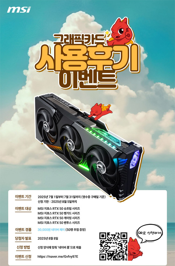 MSI는 ‘MSI 지포스 RTX 50 시리즈’ 그래픽카드 구매 고객을 대상으로 사용 후기 이벤트를 진행한다고 밝혔다.