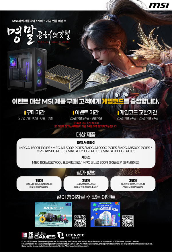 MSI는 PC 케이스 또는 파워 서플라이 구매자에게 신작 액션 RPG '명말: 공허의 깃털' 게임 코드를 증정하는 프로모션을 진행한다.