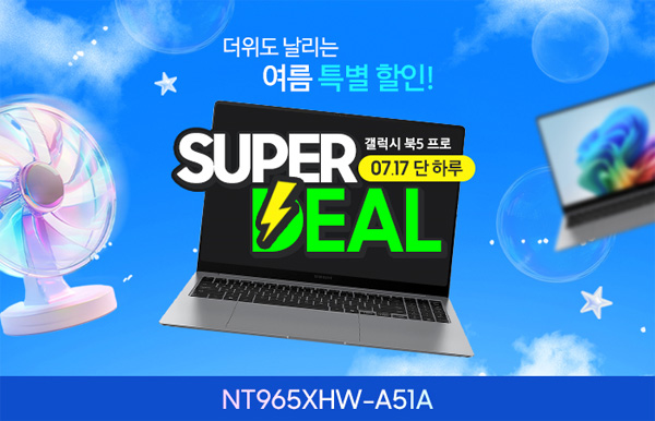 유니씨앤씨는 최신 인텔 코어 울트라 애로우레이크 프로세서와 WQXGA+ Dynamic AMOLED 2X 터치스크린을 탑재한 삼성 갤럭시북5 프로 NT965XHW-A51A 대상으로 최대 34만원 할인과 최대 24개월 무이자 할부, SSD 무료업그레이드, 제휴 혜택 등의 사은 혜택이 증정되는 ‘슈퍼딜’ 프로모션을 2025년 7월 17일 단 하루 G마켓를 통하여 진행한다.