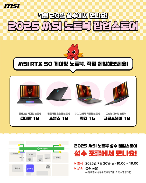 MSI는 오는 7월 20일(일), 서울 성수동 '성수 포탈'에서 단 하루 동안 'MSI RTX 50 시리즈 AI 노트북 팝업스토어'를 운영한다고 밝혔다.