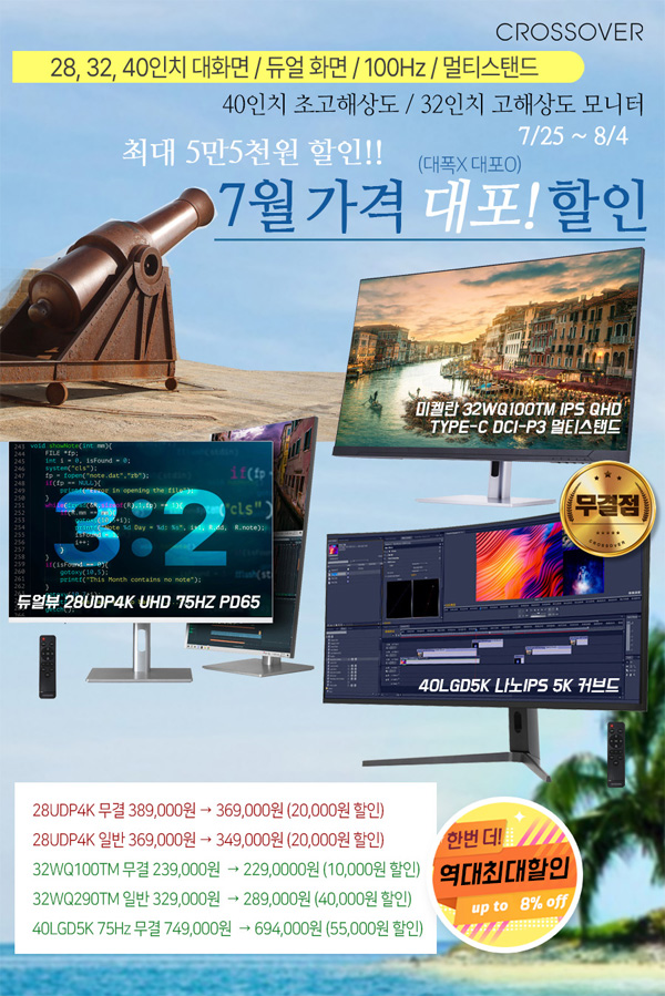 이번 행사동안 크로스오버의 인기 28인치 및 32인치, 40인치 모니터를 구입하면 최대 5만 5천원 할인을 받을 수 있다.