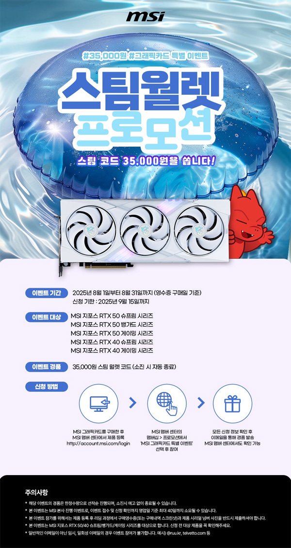 MSI 스팀 월렛 프로모션은 MSI 지포스 그래픽카드 구매 고객에게 감사의 마음을 전하고, MSI의 강력한 그래픽카드 성능과 최고의 게이밍 플랫폼 스팀(STEAM)에서 최고의 게이밍 라이프를 즐길 수 있도록 지원하기 위해 기획되었다. 프로모션 신청 기한은 2025년 9월 15일까지이며, 신청이 완료되면 담당자의 확인을 거쳐 스팀 월렛 코드가 이메일로 발송된다.증정되는 코드를 스팀 계정에 등록하면 즉시 35,000원을 충전하여 최신 게임 구매 등에 자유롭게 사용할 수 있다.