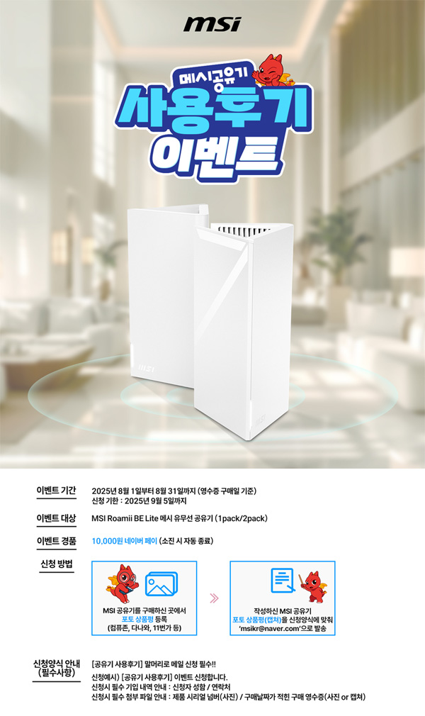 이번 행사는 2025년 8월 1일부터 8월 31일까지 MSI Roamii BE Lite 메시 유무선 공유기를 구매하고 사용 후기를 작성한 고객을 대상으로 진행된다. 기간 내 구매자들은 2025년 9월 5일까지 이벤트를 신청할 수 있다.