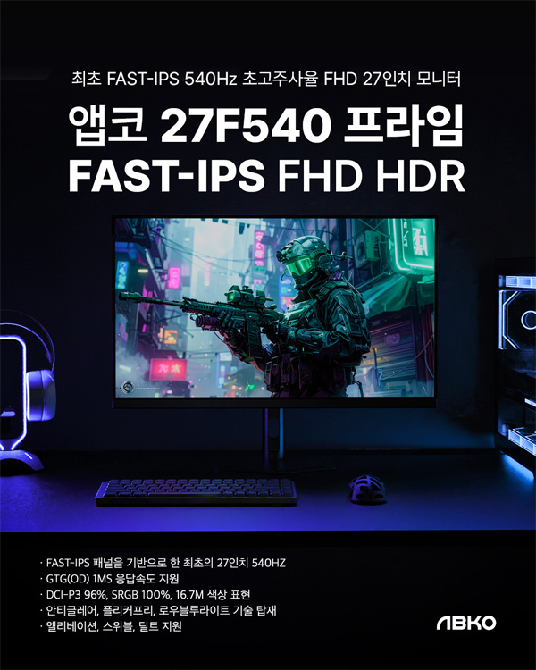 앱코에서 FAST-IPS 패널을 기반으로 540Hz 초고주사율을 구현한 27인치 게이밍 모니터, ‘27F540 프라임 FAST-IPS FHD HDR’ 모니터를 출시했다고 밝혔다.