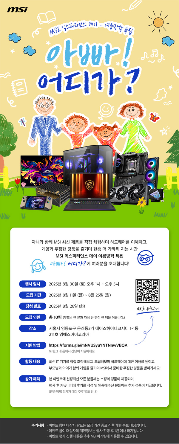 MSI는 오는 8월 30일(토) 서울 영등포구 MSI코리아에서 여름방학 특집 'MSI 익스피리언스 데이: 아빠! 어디가?' 행사를 개최한다고 밝혔다.