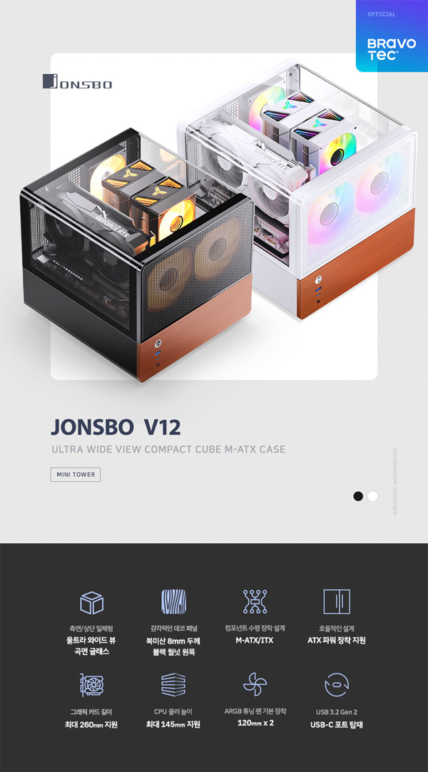 브라보텍에서 270도 파노라마 시야각의 올 글래스 디자인과 유니크한 큐브 폼팩터가 돋보이는 M-ATX 케이스 JONSBO V12를 새롭게 선보인다.