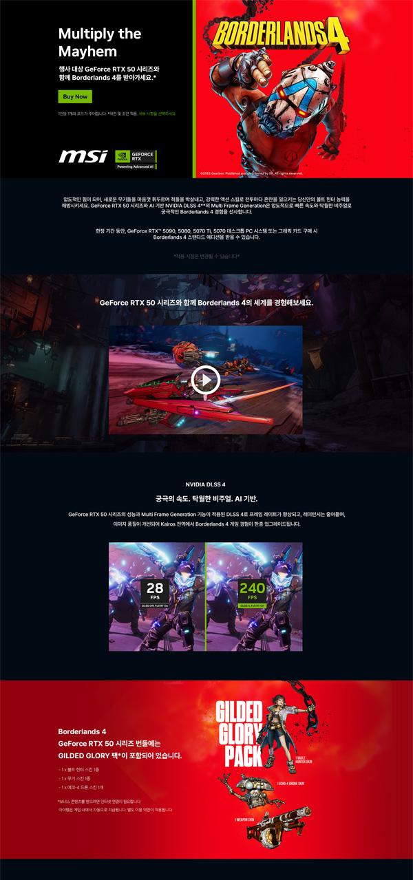 MSI는 MSI의 최신 그래픽카드 제품인 ‘MSI 지포스 RTX™ 50 시리즈’ 구매 고객을 대상으로, 기대 신작 ‘보더랜드4(Borderlands4)’를 증정하는 특별 이벤트를 진행한다고 밝혔다.