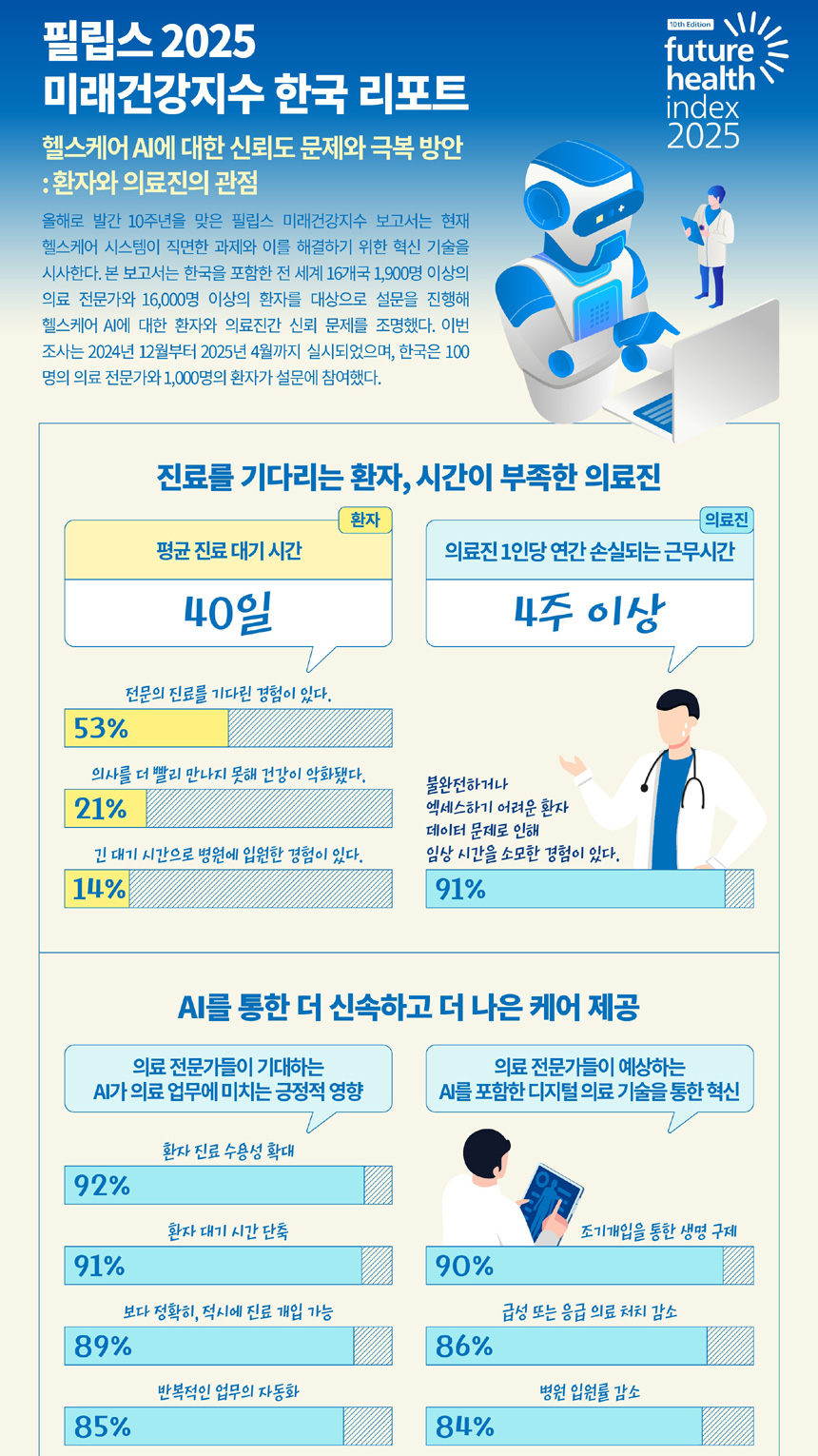 이날 간담회에서 ‘미래건강지수 보고서’ 10주년의 의의와 한국 보고서의 주요 결과를 발표한 필립스코리아 최낙훈 대표는 “의료 AI에 대한 신뢰를 높이는 일은 혁신을 앞당기고 의료진과 환자 모두에게 실질적인 혜택을 제공한다.”며, “필립스는 국내 의료 현장에서 AI가 책임감 있고 포용적으로 활용될 수 있도록 다양한 이해관계자들과 협력을 이어가겠다.”고 말했다.