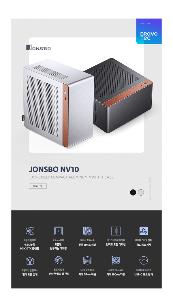 브라보텍에서 감성적인 알루미늄 외관과 원목 디테일이 조화를 이루며, 가로/세로 방향 모두 자유롭게 설치 가능한 4.5L 초소형 ITX 케이스 JONSBO NV10을 새롭게 선보인다.