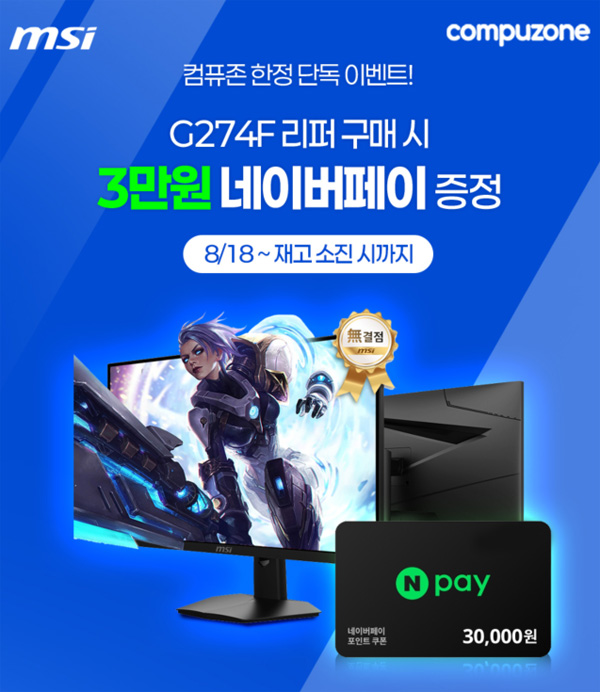 MSI는 NVIDIA G-Sync 호환 인증과 Rapid IPS 패널을 갖춘 합리적인 가격대의 고성능 게이밍 모니터 ‘MSI G274F’ 리퍼 제품이 컴퓨존에서 판매를 시작한다 밝혔다. 이번 리퍼 모델은 제천에서 열린 ‘2025 KeG 대통령배 e스포츠 대회’ 경기용으로 1회 사용된 제품으로, 보다 합리적인 가격에 대회 출품 모니터를 구매할 수 있는 기회를 제공한다.
