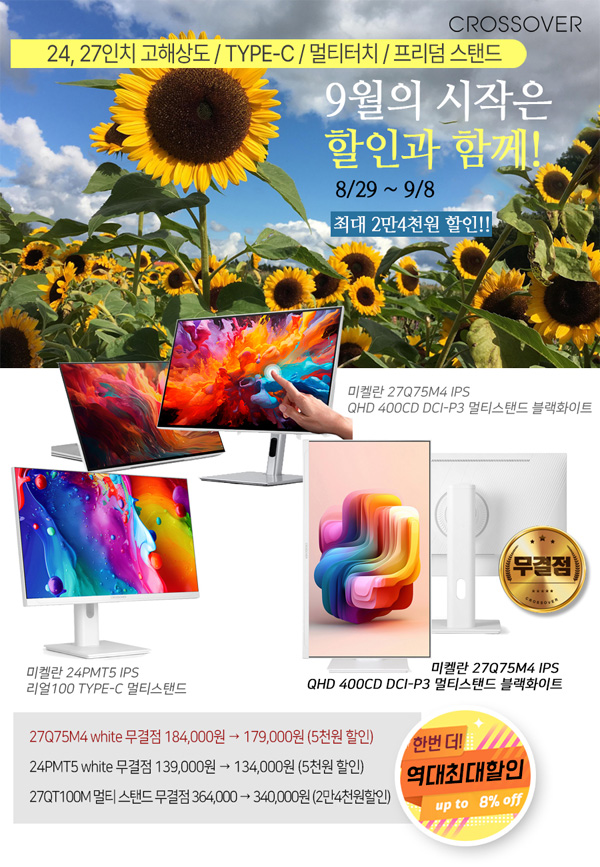 크로스오버는 멀티스탠드 및 프리덤 스탠드를 지닌 인기 고성능 & 터치 모니터 3종을 대상으로 “9월의 시작은 할인과 함께”행사를 펼친다.