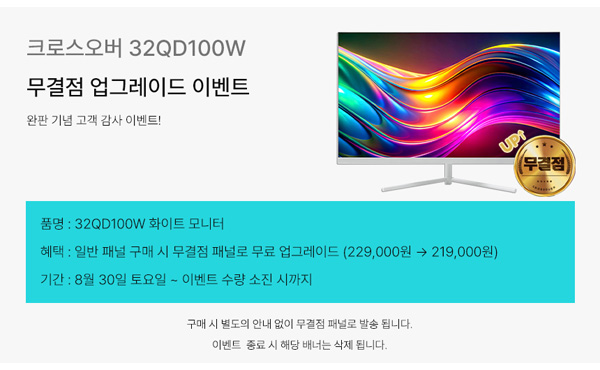 크로스오버가 32형 QHD 100Hz를 지원하는 전문가 모니터 ‘크로스오버 32QD100W IPS QHD White Color’를 대상으로 무결점 업그레이드 이벤트를 진행한다.