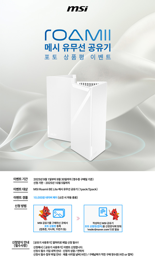MSI Roamii BE Lite 메시 유무선 공유기를 2025년 9월 1일부터 9월 30일까지 구매하고 사용 후기를 작성한 고객이라면 누구나 참여 가능하다. 기간 내 구매자들은 2025년 10월 5일까지 이벤트를 신청할 수 있다.