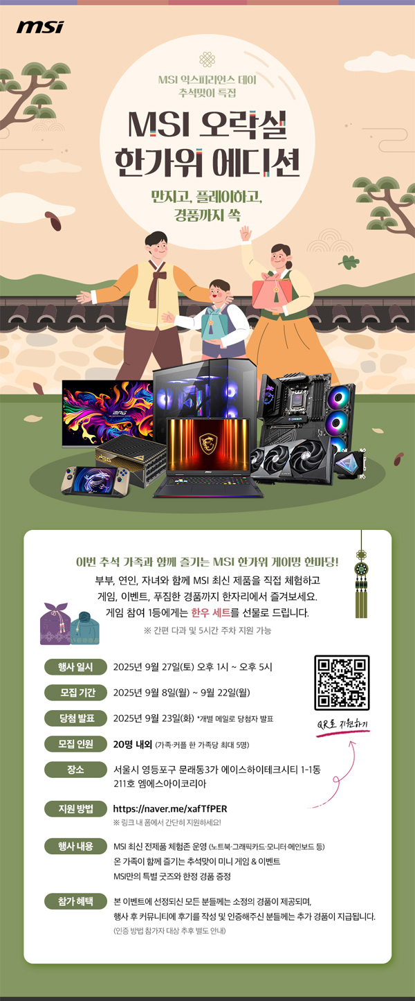 특히 행사에 참여한 가족 단위 참가자들에게는 한가위 분위기를 담은 특별 프로그램이 마련된다. 현장 게임 참여 1등에게는 한우 세트가 제공되며, 전원에게는 MSI 굿즈와 소정의 경품이 증정된다. 또한, 행사 종료 후 후기 작성자에게는 추가 경품도 지급될 예정이다.