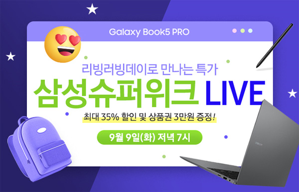이번 라이브에서는 최신 인텔 코어 울트라 시리즈 2와 WQXGA+ Dynamic AMOLED 2X 터치스크린을 탑재한 삼성 갤럭시북5 프로?프로360을 대상으로 다양한 혜택이 제공된다. 주요 혜택은 △선착순 ‘리빙러빙데이’ 쿠폰 할인 포함 최대 82만원 할인 혜택, △최대 12개월 무이자 할부, △SSD 업그레이드, △올리브영?다이소 상품권 및 한컴 오피스 등 푸짐한 사은품이 증정된다.