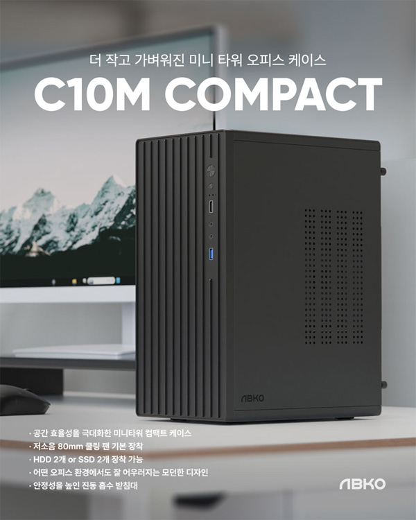 앱코에서 일반적인 오피스 환경에 최적화된 미니 타워 케이스 ‘C10M 컴팩트’를 새롭게 출시했다고 밝혔다. 이번 신제품은 작고 가벼운 설계에 집중하면서도, 뛰어난 호환성과 실용성을 두루 갖춘 것이 특징이다.