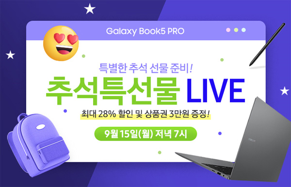 이번 라이브에서는 최신 인텔 코어 울트라 시리즈 2와 WQXGA+ Dynamic AMOLED 2X 터치스크린을 탑재한 삼성 갤럭시북5 프로?프로360을 대상으로 다양한 혜택이 제공된다. 주요 혜택은 △선착순 ‘특선물’ 쿠폰을 포함해 최대 65만원 할인 혜택, △최대 12개월 무이자 할부, △SSD 업그레이드, △올리브영?다이소 상품권, 한컴오피스 등 푸짐한 사은품이 증정된다.