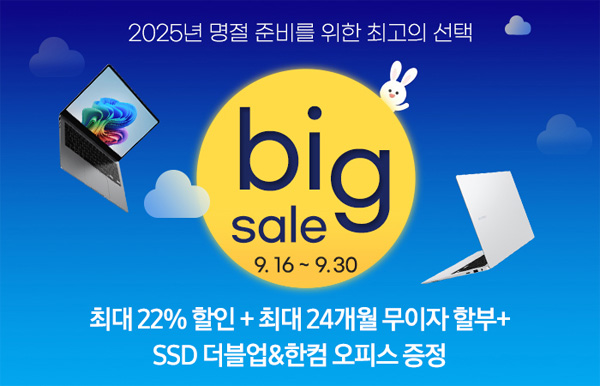 유니씨앤씨는 다가오는 추석을 맞이하여 최신 인텔 코어 울트라 루나레이크 프로세서와 WQXGA+ Dynamic AMOLED 2X 터치스크린을 탑재한 삼성 갤럭시북5 프로 NT960XHA-K51A 대상으로 최대 47만원 할인과 최대 24개월 무이자 할부, SSD 무료업그레이드,메모리 더블업 특가 혜택,한컴 오피스 등의푸짐한 사은품이 증정되는 ‘한가위 빅세일’ 프로모션을 2025년 9월 16일부터 9월 30일까지 G마켓를 통하여 진행한다.