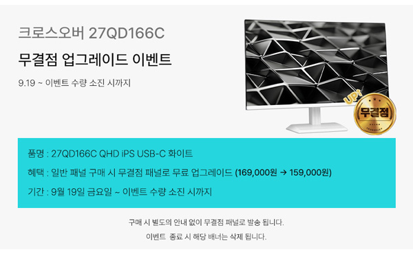 크로스오버가 27형 QHD 100Hz를 지원하는 고해상도 모니터 ‘크로스오버 27QD166C QHD iPS USB-C 화이트 Ai’를 대상으로 무결점 무료 업그레이드 이벤트를 실시한다.