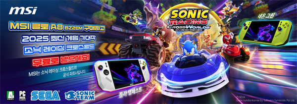 MSI는 글로벌 게임사 세가(SEGA)와 공식 파트너십을 맺고, 휴대용 게이밍 기기 클로 A8(Claw A8) 구매 고객에게 최신작 '소닉 레이싱 크로스월드(Sonic Racing: CrossWorlds)' PC 게임을 무료로 제공한다고 밝혔다.