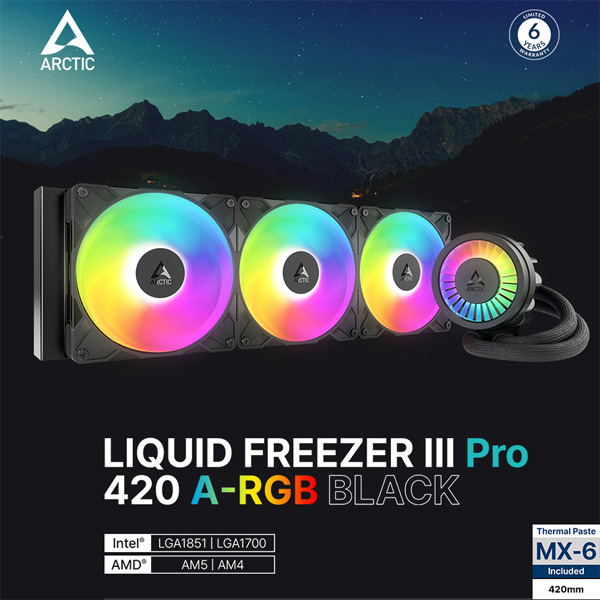 워터 펌프는 PWM 제어 방식을 채택해 시스템 온도 상황에 따라 800~2800RPM 범위에서 속도를 자동 조절, 효율적인 열 교환과 진동 및 소음 최소화를 동시에 실현한다. 펌프 내부에는 최대 2500RPM으로 작동하는 60mm VRM 보조 쿨링 팬이 내장되어 있다. ARCTIC Liquid Freezer III PRO 420 A-RGB BLACK과 WHITE는 ARGB 조명 동기화를 지원하는 LED가 탑재된다.