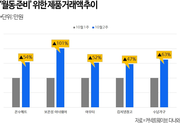 겨울 대비 제품의 상승세는 전 카테고리에서 고르게 나타났다. 온수매트 카테고리의 거래액은 직전 주 대비 54% 증가했으며 보온성 이너웨어는 101%, 아우터는 52% 증가했다.