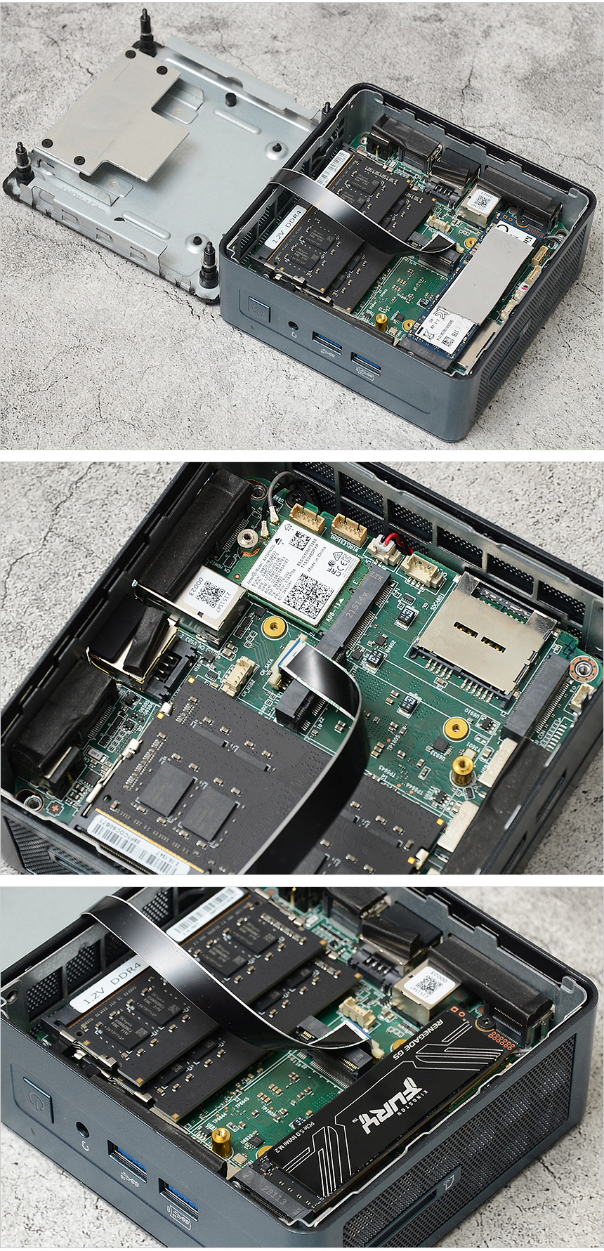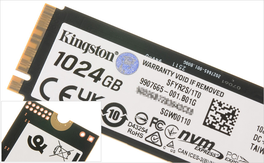 스티커를 제거한 전면 내부의 모습으로 낸드 플래시와 컨트롤러, 디램등이 부착된 것을 확인할 수 있다. 3D TLC NAND를 제품을 사용해 낮은 소비전력에서 강력한 성능을 구현한다. (참고로 3D NAND 는 좁은 셀간격으로 인해 전자가 누설되는 등의 현상이 발생하는 2D NAND 대비 저장용량 확보가 용이하며 전력 소모량을 낮춰 수명도 긴 장점을 가지고 있다.)