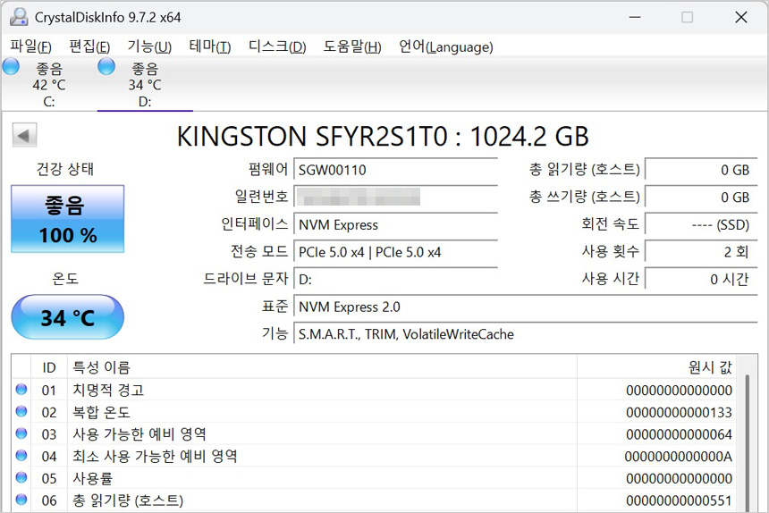 시스템 정보를 확인하고 있는 모습으로 바이오스에서 정상적으로 제품이 인식되는 것을 알 수 있으며 크리스탈 디스크인포 에서도 PCIe 5.0 x4 로 동작하는 것을 확인할 수 있었다.