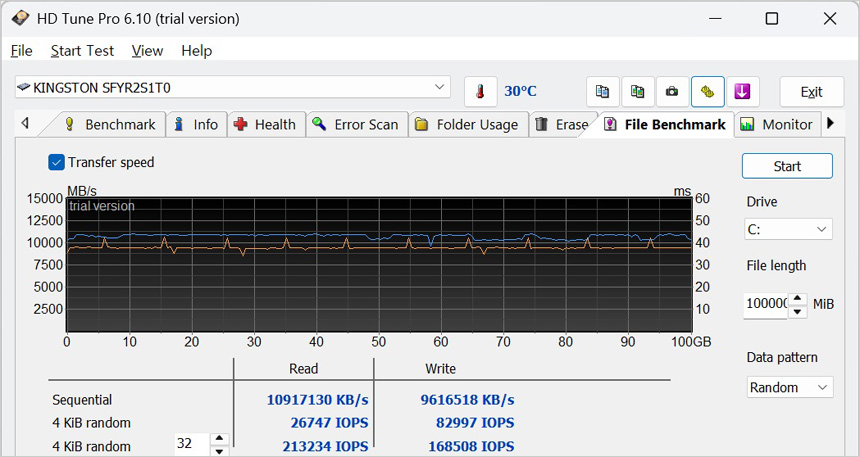 HD Tune를 이용해 대용량 파일 전송시 속도저하가 발생하는지 여부를 확인하고 있는 모습으로 100GB 용량에서 테스트를 진행했을 때 특정 구간에서 급격하게 속도가 떨어지지 않고 균일한 속도를 보여주었다. 이 제품은 디램이 기본 탑재되어 있어 데이터의 빠른 액세스가 가능할 뿐만 아니라 속도저하 없이 대용량 데이터를 전송할 수 있다.