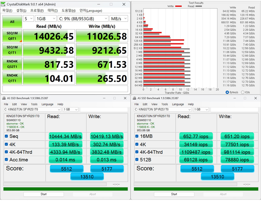 직관적으로 SSD의 속도를 확인할 수 있는 크리스탈 디스크마크를 비롯해 다양한 벤치마크 프로그램을 이용해 성능을 확인하고 있는 모습으로 스펙에 근접한 빠른 읽기/쓰기 속도를 보여주었다. AS SSD 벤치마크는 속도보다 최종 스코어를 봐주기 바란다. PCIe 3.0 제품의 경우 3000점대의 스코어를 보여주며 PCIe 4.0 모델들에서 6000~9000점 대의 스코어를 보여주는데 반해 이 제품은 13000점이 넘어가는 것을 확인할 수 있다. @ 참고로 메인보드에 따라 속도가 달라질 수 있다. 이점 참고하기 바란다.