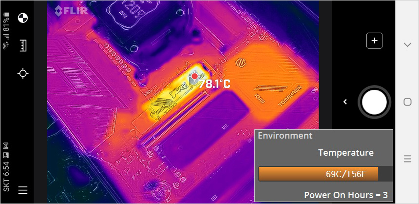 크리스탈 디스크마크의 읽기/쓰기를 2회 진행하고 3번째 실행에서 (실내온도 21도) 열화상 카메라로 SSD 온도를 확인하고 있는 모습으로 컨트롤러가 80도 초반까지 올라가는 것을 확인할 수 있었다. 전용 S/W에서는 69도 까지 온도가 올라가는 것을 확인했다. (90도 이상으로 온도가 올라갈 것으로 예상했는데 생각보다 낮은 온도로 동작했다.) @ 참고로 일반적인 PC사용에서는 이정도 까지 온도가 올라가지 않는다.