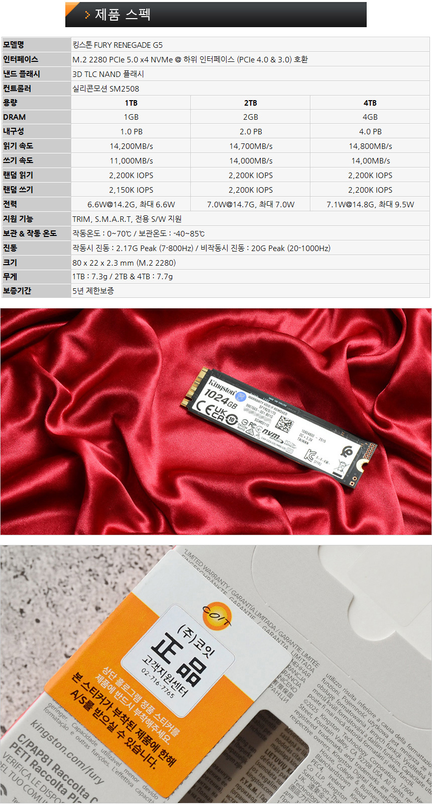 리뷰를 진행하는 킹스톤 FURY RENEGADE G5는 코잇에서 유통 및 A/S를 진행하고 있다. 직구 제품의 경우 국내에서 A/S가 불가한데 반해 스티커가 동봉된 정품의 경우 정식 A/S 가능하며 5년의 넉넉한 기간을 지원해 문제가 발생했을 때 빠르게 조치를 받을 수 있다. (5년의 넉넉한 A/S 기간을 생각한다면 코잇에서 유통하는 정품 구입을 추천한다.)