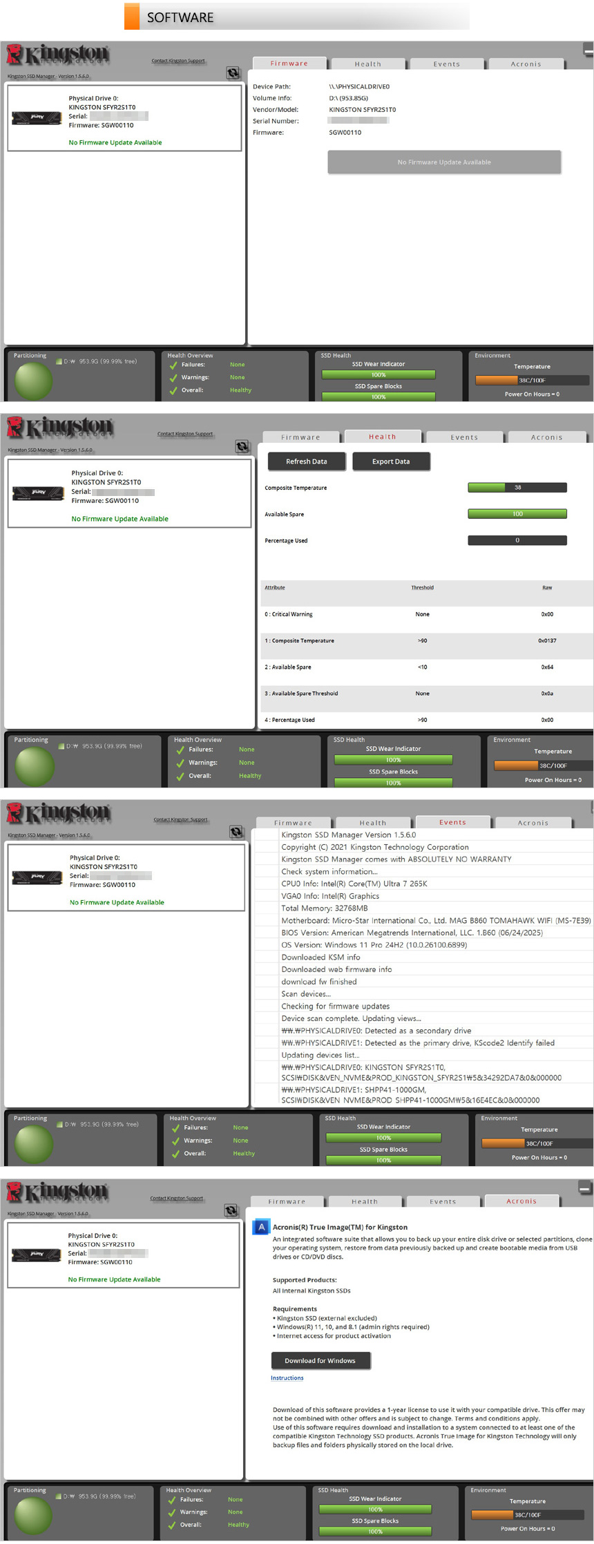 킹스톤에서 전용 S/W를 제공해 모니터링이 가능하며 드라이브 이벤트 상황을 한눈에 파악할 수 있다. 또한 펌웨어 업데이트를 통해 최상의 컨디션으로 SSD를 사용할 수 있으며 아크로니스 트루이미지 1년 무료 구독권을 제공해 백업과 복원등을 간편하게 실행할 수 있다.