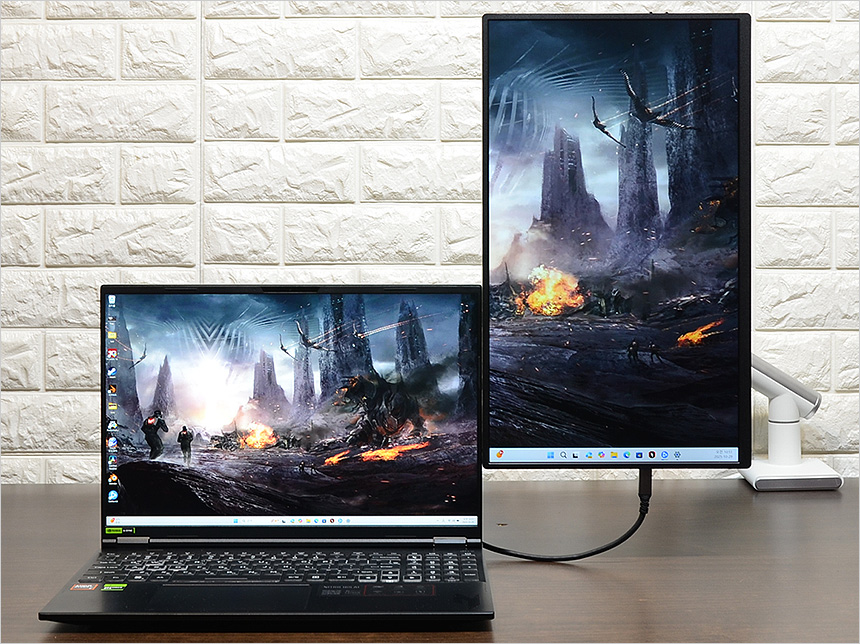 테스트를 위해 책상에 설치한 모습으로 기존의 포터블 모니터와 확연히 비교될 정도로 크기가 상당한 것을 확인할 수 있다. 서브 모니터로만 사용되는 기존 제품들과 달리 메인 모니터로도 충분히 사용할 수 있을 것이다. 또한 HDR 지원모델 답게 설정이 활성화 된 것을 확인할 수 있다.