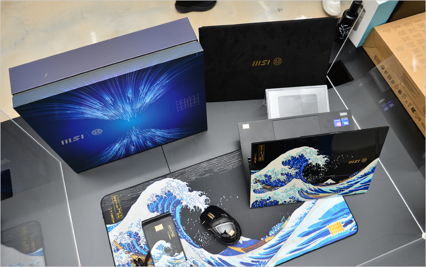 이번에는 전시된 다양한 노트북을 확인해 보도록 하자. 상단의 사진은 일본 전통 판화의 감성을 현대적으로 해석한 초경량 AI 프리미엄 노트북 프레스티지 13 AI+ 우키요에 에디션의 모습으로 단순한 노트북이 아닌 예술품 같은 존재로 제품을 만드는 아티잔 컬렉션의 첫 모델이다. 넋을 잃고 한참을 바라봤을 만큼 아름다운 외관과 높은 마감 완성도가 매력적인 노트북으로 상판에는 일본 에도시대 거장 가쓰시카 후쿠사이의 대표작 가나가와 해변의 높은 파도가 정교하게 새겨져 전통과 현대 기술이 교차하는 특별한 상징성을 전달하며 우키요에 감각을 현대적으로 재해석한 패턴이 바디 전반에 적용되어, 시각적 완성도를 한층 끌어올렸다.